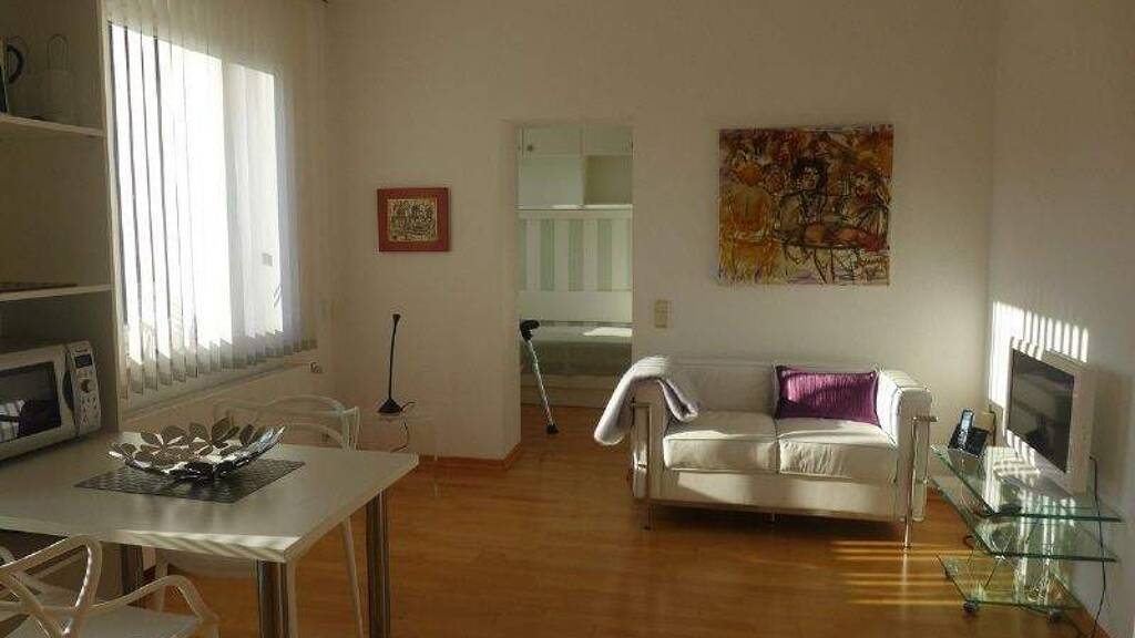Parkettboden in Wohn- Esszimmer mit integrierter Küche, Fliesenboden mit Fußbodenheizung im Wannenbad, Geschirrspülmaschine, Waschmaschine mit Trockner, Mikrowelle, elektrische Esspressomaschine, 2 Induktionsplatten mit Induktionskochgeschirr, Backofen, 1 Elektroplatte, Laptoptisch, Kabel -TV, Balkon mit UV-Licht beständigen Stühlen Putzdienst nach individueller Absprache möglich, Parken an der Straße vor dem Haus, oder falls gewünscht kann ein Stellplatz angeboten werden. Eine schnelle Internetverbindung wird mit 35,- € zusätzlich berechnet.
