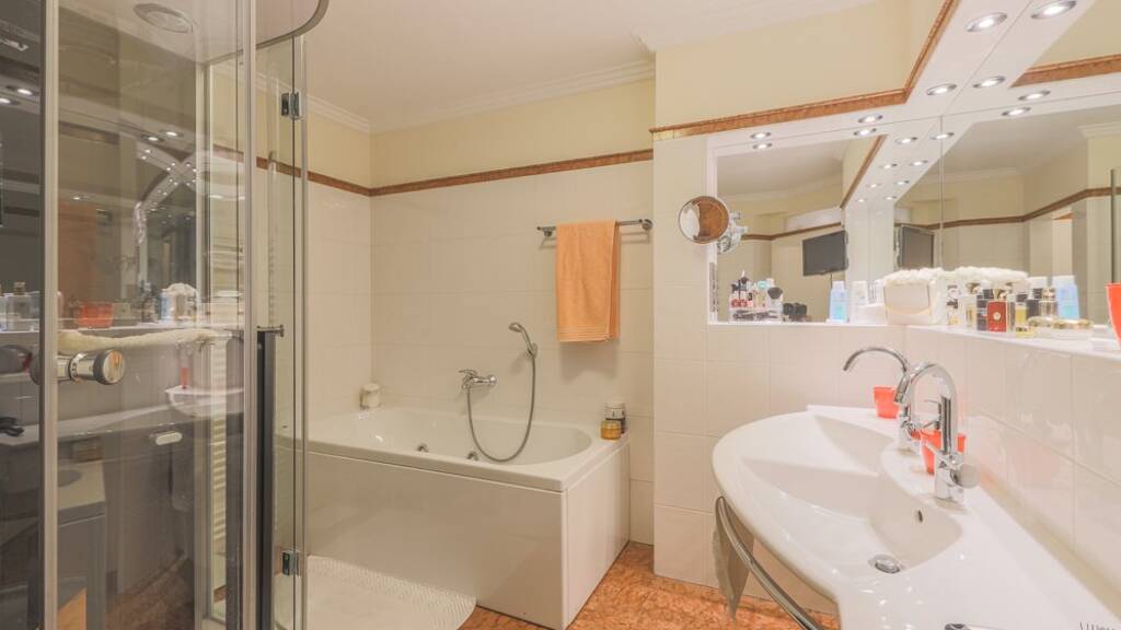 Von der Diele gelangt man ĂĽber einen zentralen kleinen Vorraum in zwei Schlafzimmer, jeweils mit Austritt auf den Balkon sowie das komfortable Badezimmer. Dieses elegante Badezimmer ist mit Doppelwaschbecken, De-Luxe-Dusche mit Infrarot, Dampf und MassagedĂĽsen sowie Badewanne mit MassagedĂĽsen versehen.