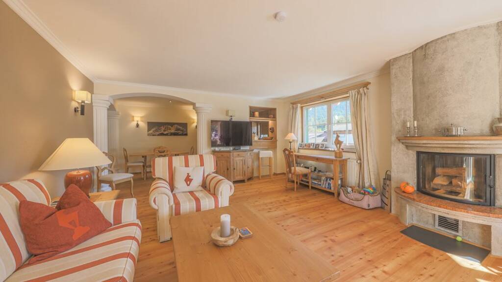 Die in der Wohnung befindlichen Säulen, kombiniert mit rustikalen Holzelementen, spiegeln eine gelungene Symbiose zwischen Eleganz und Tradition wider. Ein schöner Holzboden und viele weitere Raffinessen betonen den eleganten Stil der Wohnung.