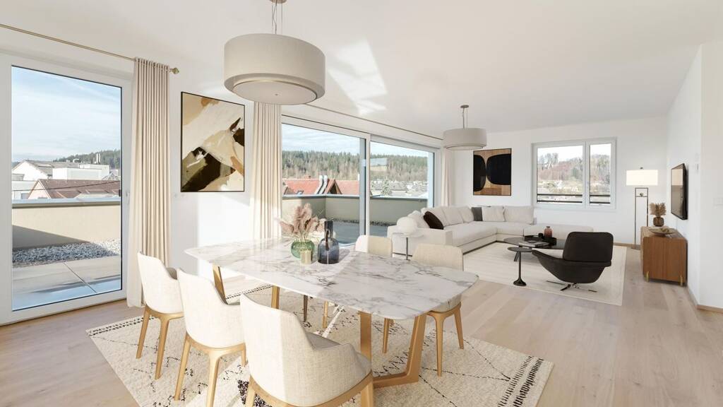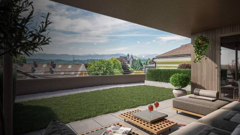 Ein echtes Highlight der Anlage stellen die Penthouse-Wohnungen dar, die neben geräumigen Loggien teilweise auch über begrünte Dachgärten und Dachterrassen verfügen. Ein herrlicher Ausblick über die Dächer von Vöcklabruck wird geboten!