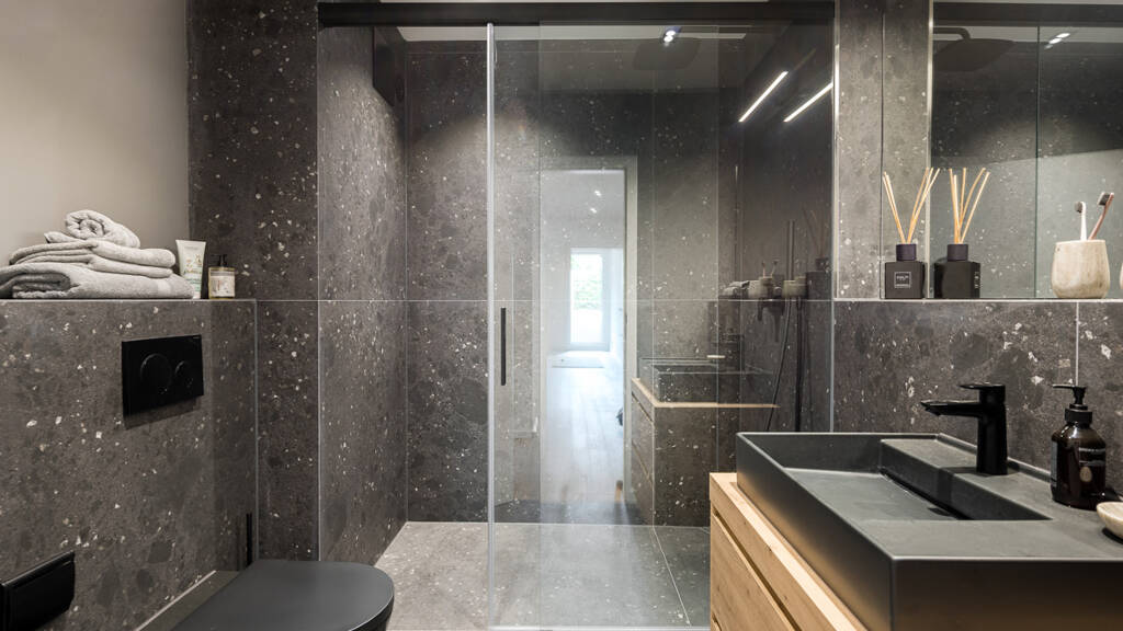 . Stylische Badezimmer (Feinsteinzeug, hansgrohe-Armaturen, Kartell by Laufen)