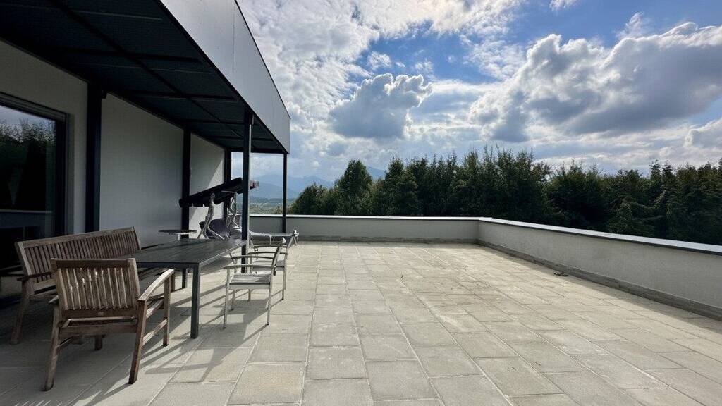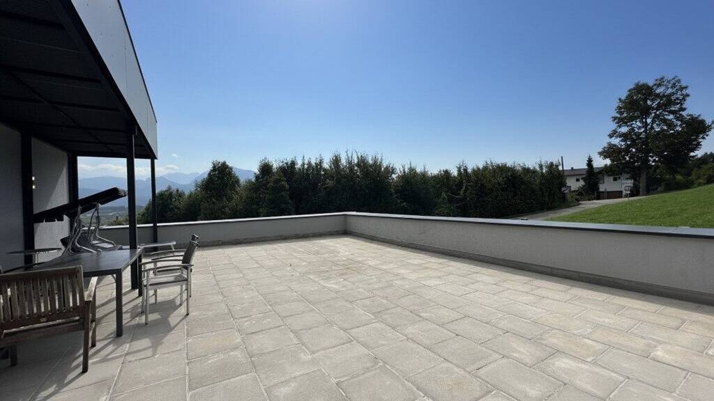 Zwei weitläufige Außenflächen - eine Terrasse mit über 100 m² und eine sonnige Loggia - eröffnen einen Panoramablick auf das Alpenvorland bis zum Traunstein. Sonne von morgens bis abends inklusive.