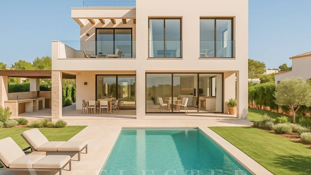 Der einladende Eingangsbereich führt in das helle und großzügige Wohn- und Esszimmer mit einer offenen, voll ausgestatteten Küche mit hochwertigen Geräten. Große Fensterfronten lassen viel Tageslicht herein und öffnen den Blick auf den Garten mit einem Salzwasserpool. Im Erdgeschoss befinden sich außerdem ein Essbereich im Freien mit Sommerküche und Grill, ein Gäste-WC sowie ein Hauswirtschaftsraum.