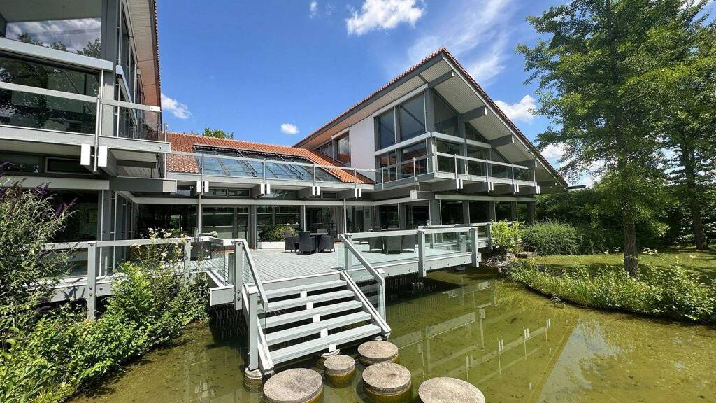 Diese besondere Immobilie mit Park überzeugt durch ihre hochwertige HUF HAUS Architektur sowie durch eine funktionale und zugleich elegante Raumgestaltung über drei Etagen – vom repräsentativen Erdgeschoss über das lichtdurchflutete Dachgeschoss bis hin zum vielseitigen Untergeschoss mit direktem Zugang zur hauseigenen Tiefgarage. Großzügige Glasflächen prägen die Architektur und schaffen eine helle, offene Atmosphäre, die Innen- und Außenräume harmonisch miteinander verbindet. Das Gebäude bietet eine Gesamtnutzfläche von ca. 1.471 m², davon rund 1.102 m² Wohnfläche, und eröffnet damit vielfältige Nutzungsmöglichkeiten – von repräsentativem Arbeiten bis hin zu exklusivem Wohnen oder einer Kombination aus beidem. Bereits die Zufahrt zum Grundstück vermittelt Exklusivität. Ein großzügiger Vorplatz, gesäumt von gepflegtem Grün und altem Baumbestand, führt zum repräsentativen Eingangsbereich. Im Inneren empfängt ein offener Empfangsbereich mit Galerie Besucher und Bewohner mit architektonischer Klarheit, Licht und Großzügigkeit. Das Erdgeschoss wurde so konzipiert, dass es sowohl den Anforderungen einer gehobenen geschäftlichen Nutzung als auch einer Wohnnutzung gerecht wird. Neben einem flexibel nutzbaren, schallgeschützten Schulungsbereich stehen mehrere stilvolle Büros beziehungsweise Besprechungsräume zur Verfügung. Im Dachgeschoss überzeugt ein durchdachtes Raumkonzept mit großzügiger Galerie, großen Fensterflächen und hochwertiger Dachverglasung. Helle Materialien und offene Strukturen schaffen eine luftige Atmosphäre und bieten ideale Voraussetzungen für kreative Arbeitsbereiche, Atelierflächen oder private Wohnräume. Ein zentraler Aufenthaltsbereich mit Küche sowie ein separates WC ermöglichen eine autarke Nutzung der Etage. Auch das Untergeschoss spiegelt den hohen Anspruch der Immobilie wider. Neben großzügigen Abstell- und Technikräumen stehen funktionale Einheiten wie Waschräume, Werkstattbereiche sowie ein separates Büro – beispielsweise für Hauspersonal oder Facility Management – zur Verfügung. Direkt angeschlossen ist die Tiefgarage mit drei Stellplätzen, ausgestattet mit Starkstromanschluss. Die Stellplatzsituation ist außergewöhnlich großzügig: • 3 Tiefgaragenstellplätze • 16 überdachte Carport-Stellplätze • 19 Außenstellplätze Damit bietet das Anwesen ausreichend Parkmöglichkeiten für Bewohner, Gäste oder Mitarbeiter. Das weitläufige Grundstück mit gewachsenem Baumbestand, großzügigen Freiflächen und einer Teichanlage unterstreicht den besonderen Charakter der Immobilie. Die parkähnliche Außenanlage bietet Raum für individuelle Erweiterungen und vielfältige Gestaltungsmöglichkeiten, beispielsweise für Pool, Pavillon oder weitere Gebäude innerhalb des vorhandenen Baufelds. Eine optionale Installation von Photovoltaik auf dem Dach ermöglicht zudem eine nachhaltige energetische Ergänzung des Gebäudes. Ein architektonisches Unikat mit Seltenheitswert – ein Anwesen, das Architektur, Natur und Identität in besonderer Weise vereint und vielfältige Möglichkeiten für exklusives Wohnen oder repräsentatives Arbeiten bietet. Die HUF HAUS GmbH & Co. KG tritt im Rahmen dieses Angebots nicht als Vertragspartner auf, sondern stellt ausschließlich den Kontakt zwischen Interessenten und dem jeweiligen Hauseigentümer bzw. Verkäufer her. Dieses Exposé dient lediglich der unverbindlichen Information und stellt kein vertragliches Angebot dar. Alle Angaben beruhen auf Informationen Dritter; für deren Richtigkeit, Vollständigkeit und Aktualität sowie für etwaige Fehler, Irrtümer, Abweichungen oder Mängel wird keine Haftung übernommen. Maßgeblich sind ausschließlich die Vereinbarungen im jeweiligen Vertrag.