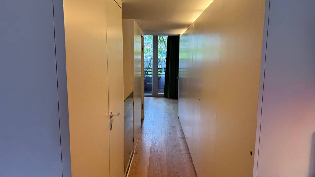 Im unteren Geschoss erwartet Sie ein offener, lichtdurchfluteter Essbereich mit einer stilvollen, maßgefertigten Einbauküche - ideal für genussvolle Kochabende. Der angrenzende Südbalkon bietet sonnige Stunden mit Blick ins Grüne. Das Schlafzimmer sowie das Badezimmer sind nach Norden ausgerichtet und verfügen ebenfalls über einen eigenen Balkon.