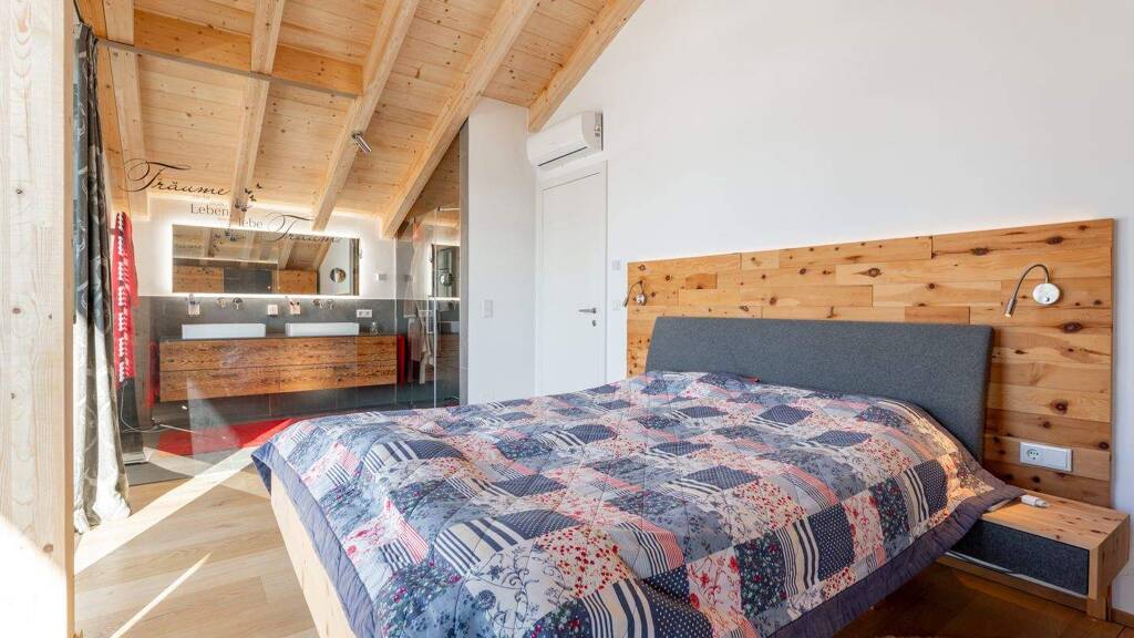 Beim Betreten der Wohnung, die über einen Personenaufzug direkt zugänglich ist, empfängt Sie ein lichtdurchfluteter Wohn- und Essbereich mit beeindruckendem Sichtdachstuhl. Die großen Fensterflächen lassen die umliegende Natur in den Raum fließen und schaffen eine warme, einladende Atmosphäre.