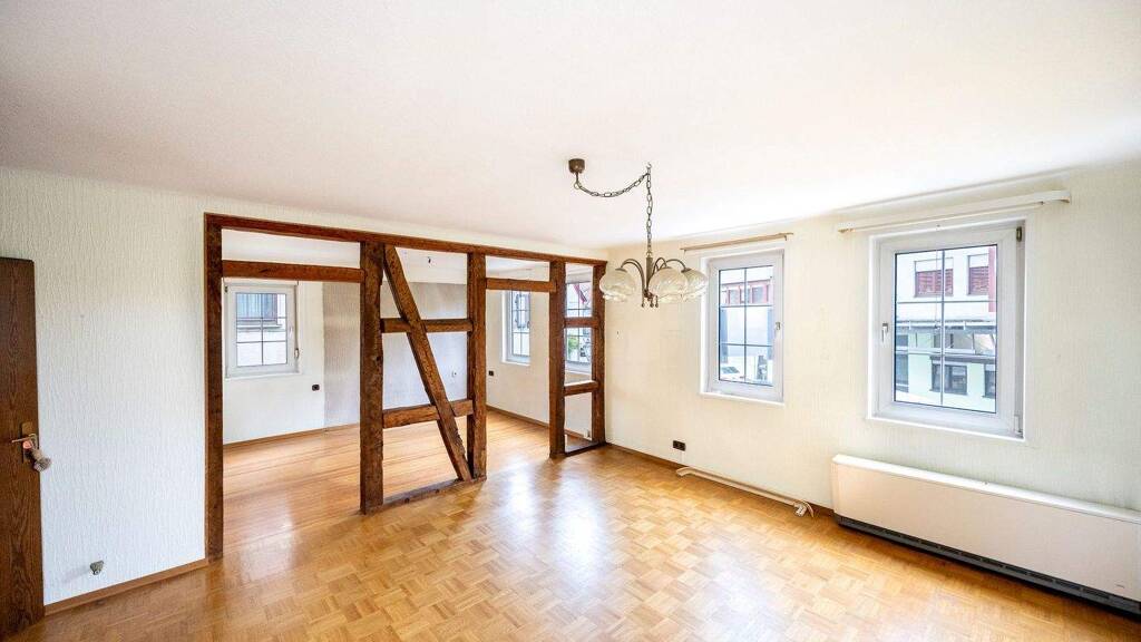Über eine interne Treppe gelangt man in das Obergeschoss, das mit seiner großzügigen Fläche und mehreren Zimmern vielfältige Gestaltungsmöglichkeiten bietet. Das offene Wohn- und Esszimmer bildet das Herzstück dieser Etage. Sichtbare Balken setzen dabei stilvolle Akzente und verleihen dem Raum Charakter. Große Fensterflächen sorgen in allen Bereichen für viel Tageslicht und ein angenehmes, luftiges Wohngefühl. Ein geräumiges Schlafzimmer mit direktem Zugang zum Balkon ergänzt das Obergeschoss auf attraktive Weise.