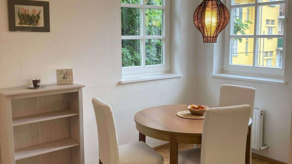 Die Wohnung verfügt über eine Wohnfläche von etwa 35 m² und befindet sich in einer hellen und ruhigen Innenhoflage (kostenloser Parkplatz auf Anfrage verfügbar). Beim Betreten der Wohnung gelangt man in einen kleinen Vorraum mit Fenster und praktischem Stauraum. Das Badezimmer ist mit WC, Dusche und einer Waschmaschine ausgestattet. Der Wohn- und Schlafbereich ist offen gestaltet und bietet eine gut ausgestattete Küchenzeile mit Backrohr, Herd, Geschirrspüler sowie einem freistehenden Kühlschrank mit Gefrierfach. Eine Grundausstattung an Geschirr ist vorhanden. Ein Esstisch mit vier Stühlen lädt zum Verweilen ein. Zudem gehören ein großes Doppelbett, ein großer Kleiderschrank und eine ausziehbare Couch zur Einrichtung. Für ausreichend Sicht- und Sonnenschutz sorgen Innenrollos an den Fenstern.