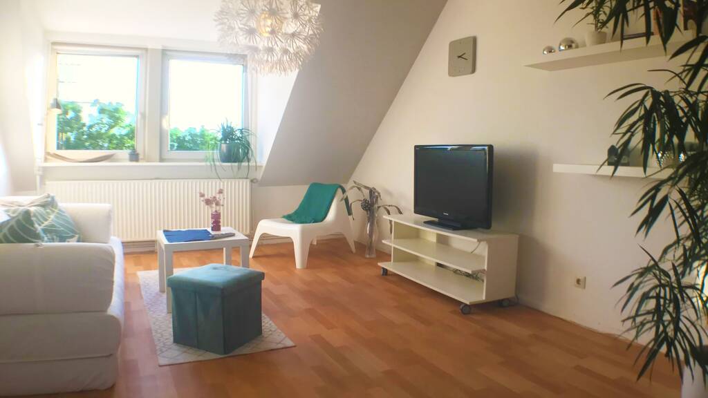 Fühle Dich wie zu Hause in dieser gemütlichen 2,5 Zimmer-Dachgeschoss-Wohnung. Die erst kürzlich renovierte Wohnung verläuft über zwei Etagen, ist ca. 55qm groß und verfügt über ein Doppelbett (160x200), Schlafsofa, Küche mit Gasherd, Kaffeemaschine, Wasserkocher, Badewanne, TV Box & WiFi.