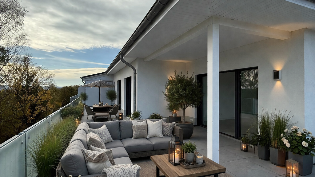 Das besondere Highlight dieser Wohnung ist die umlaufende Dachterrasse, die sowohl den Wohnbereich als auch die Schlafzimmer umfasst. Geschützt durch Bäume und dezente Glaselemente genießen Sie hier in absoluter Privatsphäre sowohl den Sonnenaufgang als auch den Sonnenuntergang. Damit bietet die Terrasse die perfekte Alternative für alle, die auf einen pflegeintensiven Garten verzichten, die Natur und die Sommer auf der Terrasse im Grünen aber nicht missen möchten.
