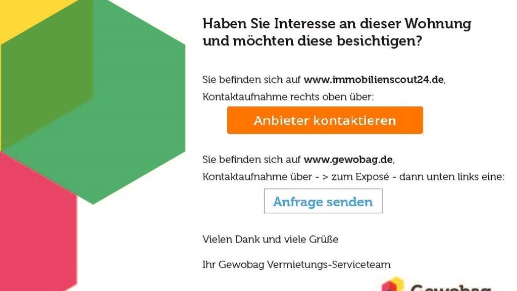 ACHTUNG: Cyberkriminelle versuchen sehr professionell das Design unserer E-Mails nachzuahmen, um Sie über einen Link auf manipulierte Websites zu leiten und persönliche Daten von Ihnen zu erlangen oder Sie zu Zahlungen aufzufordern. Unser Vermietungsprozess verlangt kein Dokumentenupload vor der Wohnungsbesichtigung. Wir stellen keine Mietverträge über einen Download-Link bereit. Wir fordern Sie auch nicht auf, Zahlungen zu leisten. Achten Sie bei jeder E-Mail genau darauf, wohin ein Button (Link) den Sie anklicken sollen, oder die E-Mail, wenn Sie auf "Antworten" gehen, führt. Unsere Angebote sind provisionsfrei. Als Mieter zahlen Sie für die Vermittlung des Mietvertrags keine Provision, sofern Sie nicht selbst einen Vermittler/Makler beauftragt haben. Im Auftrag der Gewobag tätige Vermittler werden keine Provision von Ihnen verlangen.