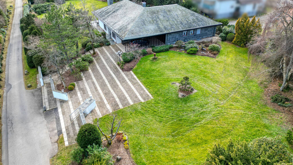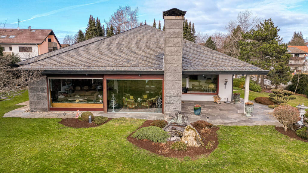 Die Villa begrüßt ihre Bewohner mit einer beeindruckenden Einfahrt, flankiert von einer großen Wiesenfläche und duftenden Blumenbeeten. Der überdachte Eingangsbereich, den Sie trockenen Fußes von der großen Doppelgarage aus erreichen, führt Sie in die separate Einliegerwohnung sowie in den großzügigen Hauptbereich des Anwesens.