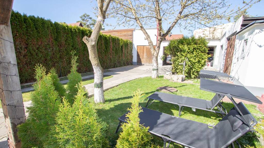 Autofans aufgepasst: Vier Garagen und eine Werkstatt mit Hebebühne bieten den perfekten Platz für Ihre Fahrzeuge oder Hobbyprojekte. Der Garten mit überdachtem Pavillon lädt zum Entspannen ein - hier können Kinder spielen, Grillabende stattfinden oder einfach nur die Natur genossen werden.