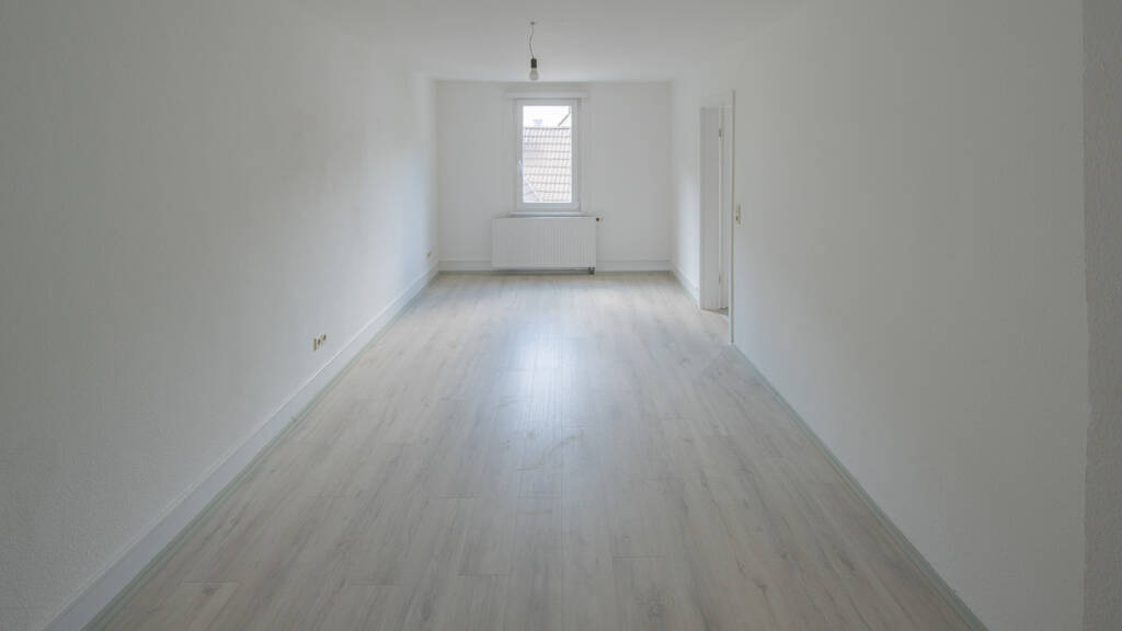 Die Wohnung befindet sich im 3. Obergeschoss und verfĂĽgt ĂĽber einen groĂźzĂĽgigen und hellen Wohnbereich mit angrenzender KĂĽche, zwei Schlafzimmer sowie ein Dusch- und Wannenbad.