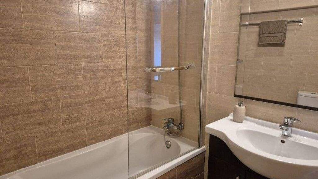 Eine Treppe vom Wohnzimmer führt zu einem Flur mit Türen zu zwei Doppelzimmern, beide mit Kleiderschränken und Balkonen, und einem stilvollen Familienbadezimmer mit Badewanne.