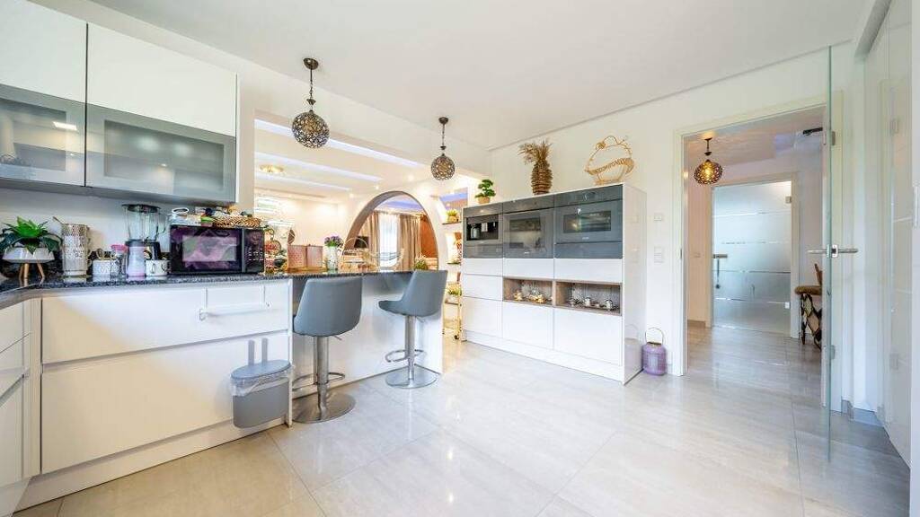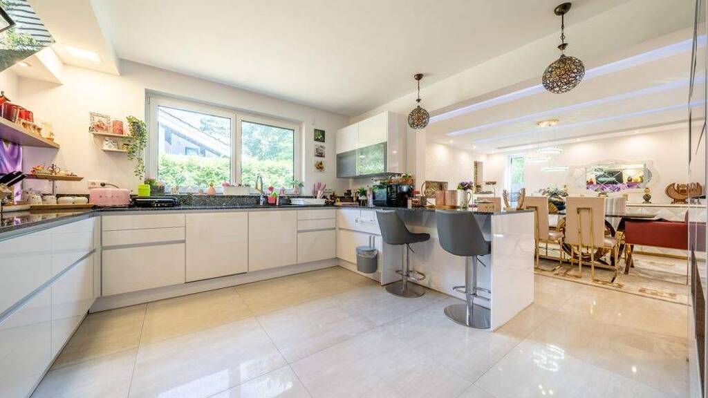 - Sechs Zimmer - Drei hochwertige Bäder - Elektrische Rollläden - Hochwertige Einbauküche mit Marmorarbeitsplatte und Markengeräten - Designerfliesen im Erdgeschoss - Parkettboden im Obergeschoss - Fußbodenheizung im gesamten Haus - Photovoltaik für Warmwasser - Großer Wintergarten - Alarmanlage - Ca. 40m² große Doppelgarage - Videoüberwachter Eingangsbereich - Hochwertig eingefriedetes Anwesen mit elektrischem Schiebetor