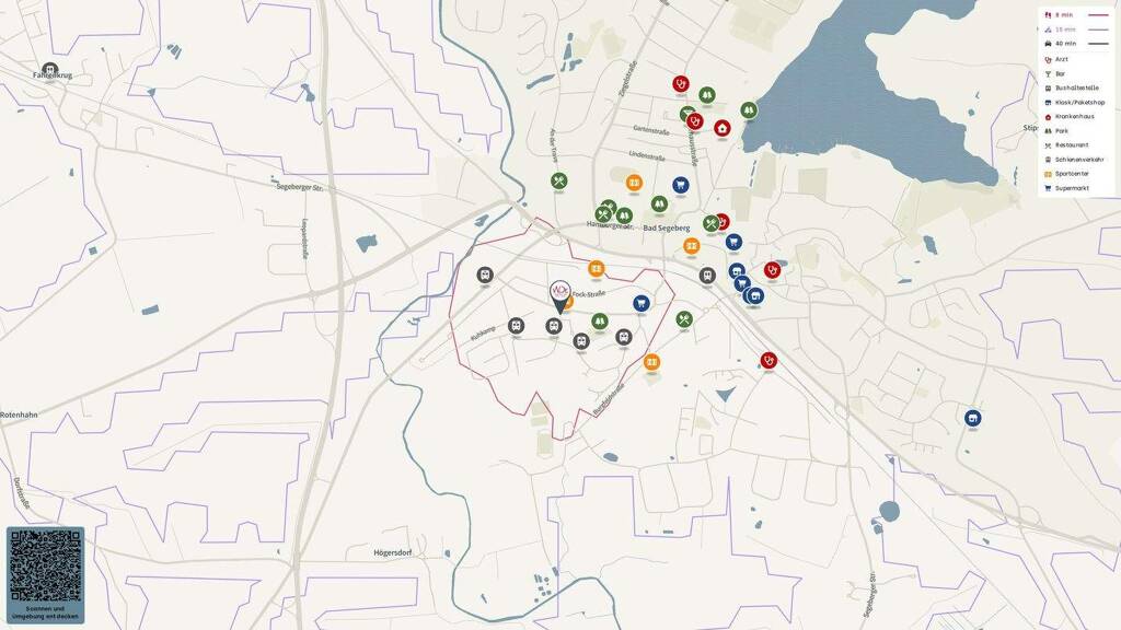 Mobilitätsanbindung Die Anbindung an den öffentlichen Nahverkehr ist bequem: Mehrere Bushaltestellen befinden sich in kurzer Distanz, teils bereits nach ca. 150 m bis 300 m. Von dort bestehen Verbindungen innerhalb von Bad Segeberg, unter anderem in Richtung Bahnhof und ZOB. Der Bahnhof Bad Segeberg liegt im Stadtgebiet und ist als zentraler Umstiegspunkt für den regionalen Bahnverkehr nutzbar.