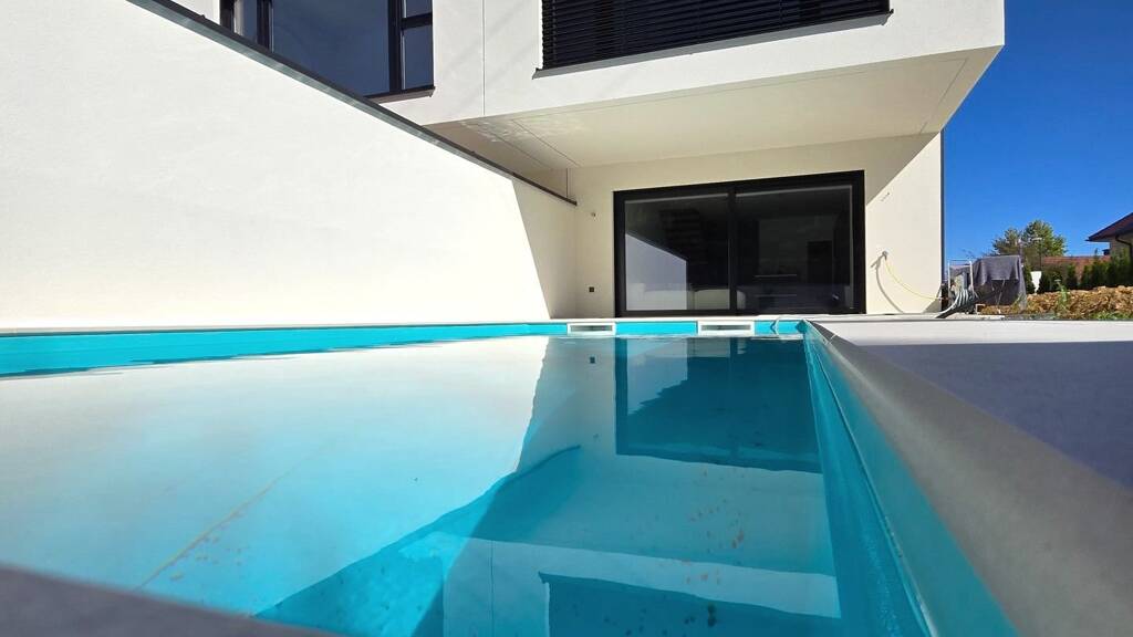 Die bedachte Aufteilung ist Ihren hohen Ansprüchen gewachsen. Auf einer Ebene vereint bietet der offene, kuschelige Wohnbereich mit Blick in den Garten und zum Pool, mit modernem Esszimmer und geräumiger Küche und Kaminanschluss, den perfekten Treffpunkt für ein gemütliches Beisammensein. Im Obergeschoß befinden sich die geräumigen Schlafräume für Eltern und Kinder. Vom Wohnbereich ausgehend gelangen Sie auf die südwestseitig ausgerichtete, ca. 135 m² - 284 m² große Gartenfläche mit eigenem Pool, wo Sie Ihre Freizeit in vollen Zügen genießen können. Das geräumige Badezimmer mit Doppelwaschbecken, großer Dusche und Badewanne harmoniert perfekt im Einklang mit den verwendeten Materialien. Darüber hinaus verfügt das Schlafzimmer über ein "en-suite" Badezimmer und Schrankraum, die puren Luxus verkörpern.