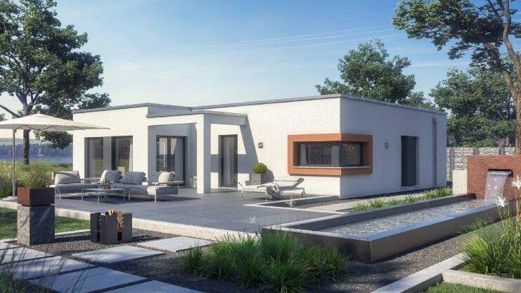 Besondere Komfortdetails wie die Eltern-Ankleide und zwei separate Bäder schaffen Luxus im Alltag. Ob Flach-, Walm- oder Satteldach - der Bungalow passt sich flexibel Ihren individuellen Vorstellungen an. Zusätzliche Highlights sind optionale Terrassen- und Überdachungslösungen, die Innen- und Außenraum harmonisch verbinden.