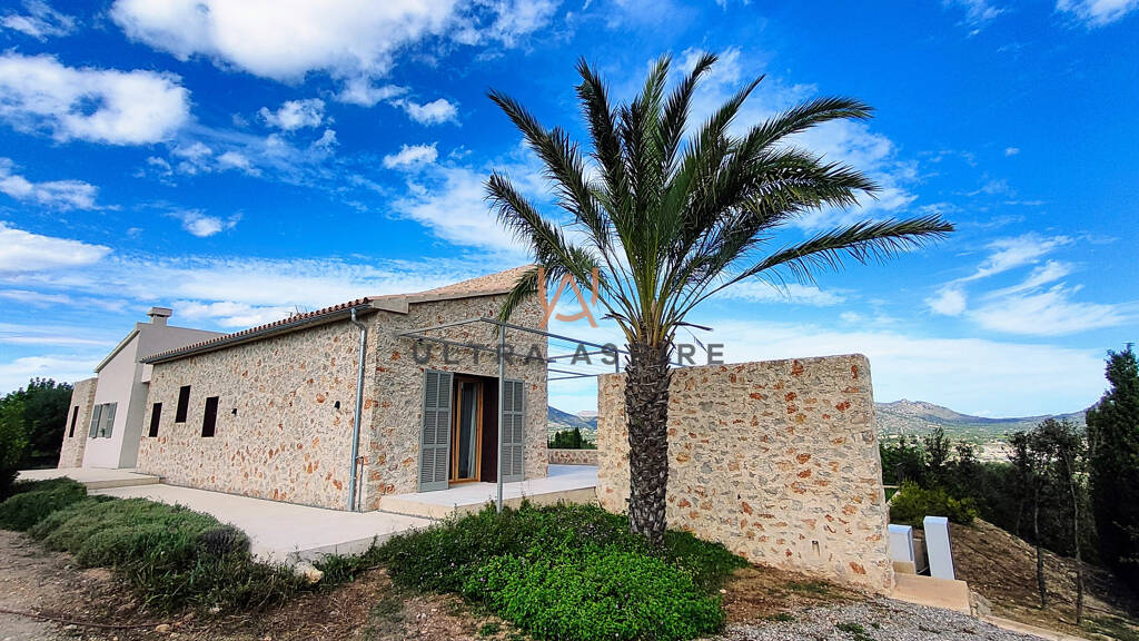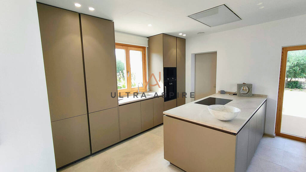 Der moderne und eklektische Stil des Hauses verbindet Schlichtheit und klare Linien mit Steinwänden und großen hellen, offenen Räumen, die durch die großen Fenster mit natürlichem Licht durchflutet werden. Die erste Etage bietet einen großzügigen Eingangsbereich mit weitreichender Aussicht, eine voll ausgestattete Küche mit Luxusgeräten, die an den Essbereich angrenzt, und ein großzügiges Wohnzimmer mit dreiseitigem Kamin, das auf eine große Terrasse mit Außenküche führt, von der aus man den Pool und den Garten überblicken kann. Der Flur führt zu zwei Doppelschlafzimmern mit Einbauschränken, einem Badezimmer und der Master-Suite mit einem luxuriösen Badezimmer en suite.