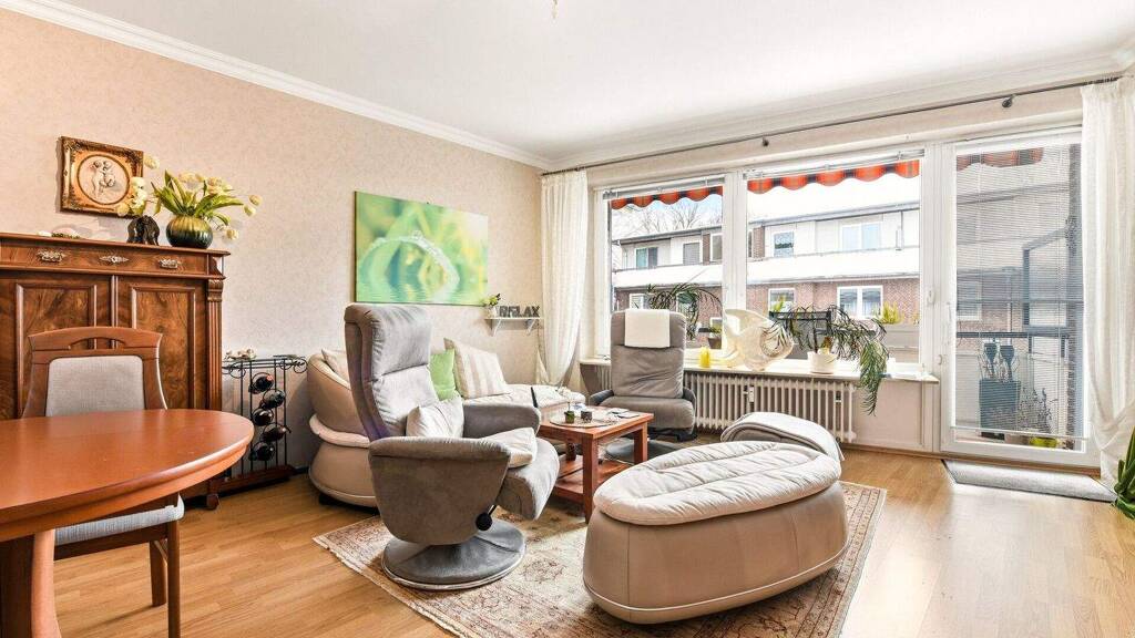 Die großzügig geschnittene, helle 2,5 Wohnung hat ca. 72 m² Wohnfläche und liegt im 1. Obergeschoss eines gepflegten Mehrfamilienhauses aus dem Jahr 1976. Die Wohnung ist auffallend gut geschnitten: Empfangen werden Sie im großen, freundlichen Eingangsbereich, von hier gehen alle anderen Zimmer ab. Das Badezimmer ist hell gefliest und hat eine Badewanne. Zusätzlich gibt es ein separates WC. Die weiße Einbauküche ist mit allen üblichen Elektrogeräten ausgestattet. Das helle Wohnzimmer bietet Zugang zum großen und sonnigen Balkon mit Süd-West Ausrichtung und Markise. Das dritte Zimmer wurde als Arbeitszimmer genutzt.