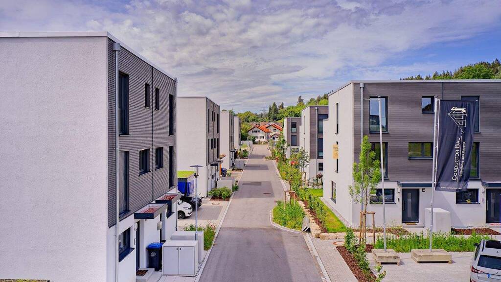 Wohnen mit Verantwortung - das Quartier Con Bravura: . Eingebettet in ein lebenswertes Mehrgenerationen-Wohnquartier . Energieeffizienter Holzbau nach KfW-Standard für klimafreundliches Wohnen . Photovoltaikanlagen auf allen Dächern zur eigenen Energieerzeugung . Elektroladestationen für jede Wohneinheit vorbereitet . Kooperation mit Car-Sharing Pfaffenwinkel e.V. für nachhaltige Mobilität . Verkehrsberuhigte Straßen und großzügiger, schadstofffreier Quartiersspielplatz . Regenwassermanagement mit naturnaher Einbindung ins eigene Biotop