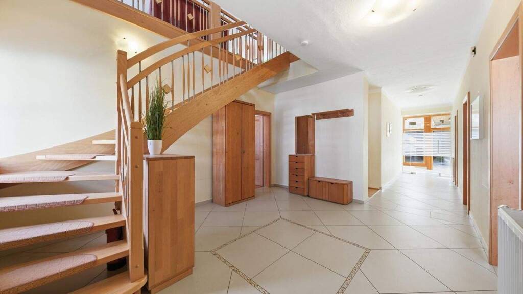 Das großzügige Wohngebäude erstreckt sich über zwei helle und freundliche Stockwerke, die über einen zentralen Eingang zugänglich und durch einen hellen, geräumigen Vorraum miteinander verbunden sind. Mit einer Wohnnutzfläche im Erdgeschoss von ca. 229 m² sowie ca. 215 m² im Dachgeschoss wird hier ausreichend Platz zum Wohnen und Arbeiten in einladender Atmosphäre geboten.