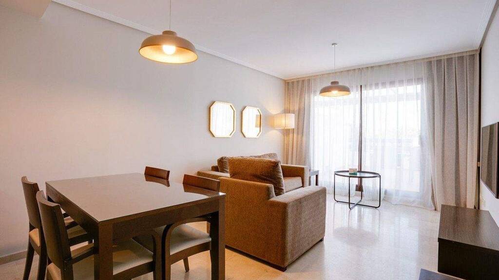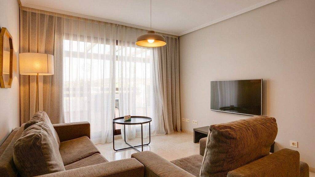 Die Wohnung bietet eine Wohnfläche von 90 m² und verfügt über ein geräumiges Wohnzimmer, zwei komfortable Schlafzimmer und zwei moderne Badezimmer. Zur Immobilie gehört außerdem eine 34 m² große Terrasse mit gemütlichen Sitzgelegenheiten und herrlichem Blick auf die umliegenden Berge und den Golfplatz. Die Wohnung ist komplett ausgestattet, inklusive Klimaanlage mit Heiz- und Kühlfunktion, Marmorböden, Einbauschränken und Doppelverglasung für maximalen Komfort.
