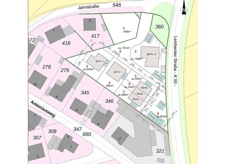 Das 608 qm große Baugrundstück (Baugrundstück 1 auf dem Plan) ermöglicht eine freistehende Einfamilienhausbebauung / eine Doppelhausbebauung. In weniger als 5 Gehminuten erreichen Sie einerseits die komplette Infrastruktur des täglichen Bedarfs, andererseits sind Sie in wenigen Gehminuten in der puren Natur. Das Grundstück wird voll erschlossen angeboten und kann zeitnah bebaut werden! Die Grundstücksgröße ist sowohl für eine Einfamilienhausbebauung als auch für eine Doppelhausbebauung absolut optimal, nicht zu groß und nicht zu klein! Für das Grundstück gibt es keinen Bebauungsplan, die Bebauung ist somit variabel und muss sich dabei lediglich in die Nachbarbebauung einfügen. Das Grundstück ist bauträgergebunden!