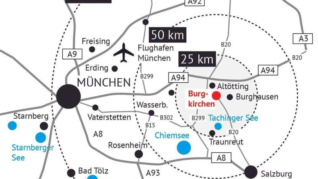 Über die A94 ist Burgkirchen mittlerweile sehr gut an München angeschlossen. In ca. 45 Minuten erreicht man die Landeshauptstadt mit dem PKW. Die phantastische Bergwelt und die vorgelagerten Seen sind nur eine gute halbe Stunde Fahrtzeit entfernt.