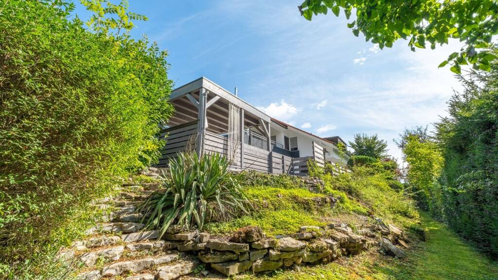 Zudem bietet das großflächige Grundstück eine Vielzahl an Terrassen und Freisitzflächen. Weiterhin beinhaletet das Familiendomizil eine moderne Einbauküche sowie ein Kamin und eine große Garage für zwei Autos. Insgesamt bietet das Grundstück Platz für 8 Fahrzeuge.