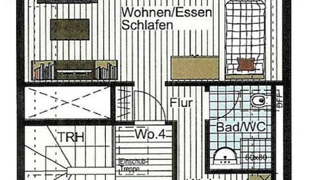 Die Wohnung verfügt über einen Wohn-/Ess-/ Schlafbereich, einer Küche, ein Bad/ WC mit Dusche.