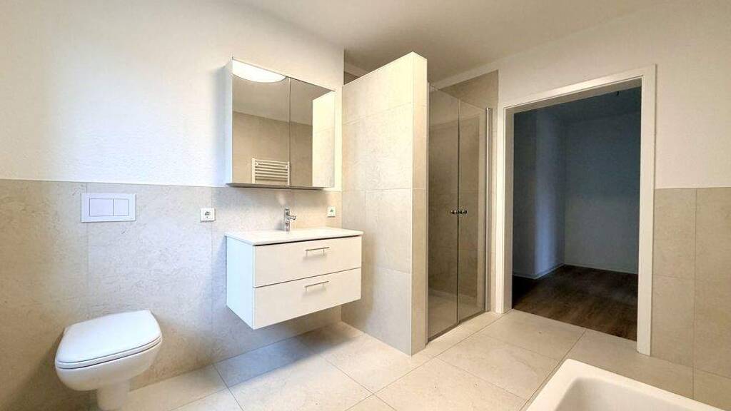 Diese moderne 3-Zimmer-Wohnung mit einer Wohnfläche von ca. 88 m² befindet sich im Erdgeschoss eines massiven Neubaus aus dem Jahr 2023. Die Wohnung überzeugt durch einen klar strukturierten Grundriss und eine moderne Ausstattung. Der Wohnbereich bietet direkten Zugang zur Terrasse, die den privaten Bereich ideal ergänzt. Darüber hinaus steht eine Gartenmitbenutzung zur Verfügung. In der gesamten Wohnung sind pflegeleichte PVC-Böden sowie Fliesen in den entsprechenden Bereichen verlegt. Eine Fußbodenheizung sorgt für ein angenehmes Raumklima, betrieben über eine effiziente Wärmepumpe. Die Einbauküche ist bereits vollständig integriert und bietet eine solide Grundlage für den Alltag. Das Badezimmer ist mit einer Badewanne und einer separaten Dusche ausgestattet und entspricht aktuellen Wohnstandards. Ein Abstellraum innerhalb der Wohnung sorgt für zusätzlichen Stauraum und erleichtert die Organisation des täglichen Bedarfs. Stellplätze befinden sich direkt am Haus und können auf Wunsch separat angemietet werden. Die monatliche Kaltmiete beträgt 1.200 € zuzüglich 200 € Nebenkosten. Die Kaution entspricht zwei Nettokaltmieten. Die Wohnung ist sofort bezugsfrei.