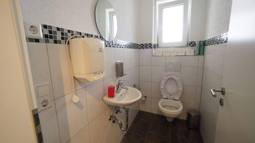 Der Zugangsbereich zu den Sanitäranlagen befindet sich in einem gemeinschaftlich genutzten Vorraum, der von beiden Gewerbeeinheiten im Haus genutzt wird. Dort befinden sich drei getrennte WC-Anlagen - Damen, Herren und Personal. Ein seitlicher Zugang zum Vorraum steht ebenfalls zur Verfügung und kann für Mitarbeiter genutzt werden.