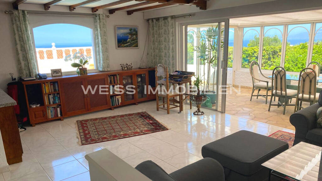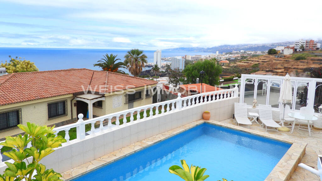 - Begehrte Lage in der Urbanización La Romántica II - Ecklage mit Nachbarn nur auf einer Seite - Zur anderen Seite kommunale Grünfläche als quasi-eigener zusätzlicher Garten - Panoramameerblick entlang der Küste zu beiden Seiten - Swimmingpool mit Gegenstromanlage, beheizt über die Photovoltaikanlage inklusive Batteriespeicher - Elektrizität für das Haus und den Pool aus eigener Photovoltaikanlage - Das Haus verfügt über die Lizenz zur touristischen Vermietung - Großer Wohnbereich mit Salón und anliegendem Wintergarten, der zur Terrasse mit dem Schwimmbad komplett geöffnet werden kann - Zwei Schlafzimmer mit großen Einbauschränken aus Massivholz - Eingebauter Safe im Schlafzimmer - Badezimmer mit großer Duschkabine - Toilette mit Waschbecken separat - Zusätzliches Außentoilette und Dusche am Pool - Dachterrasse als besonderer Aussichtspunkt zum Genießen - Große verschließbare Garage am Haus - Tennisclub nur wenige Schritte entfernt - Kurze Wege zur Autobahn und ins Zentrum von Puerto de la Cruz