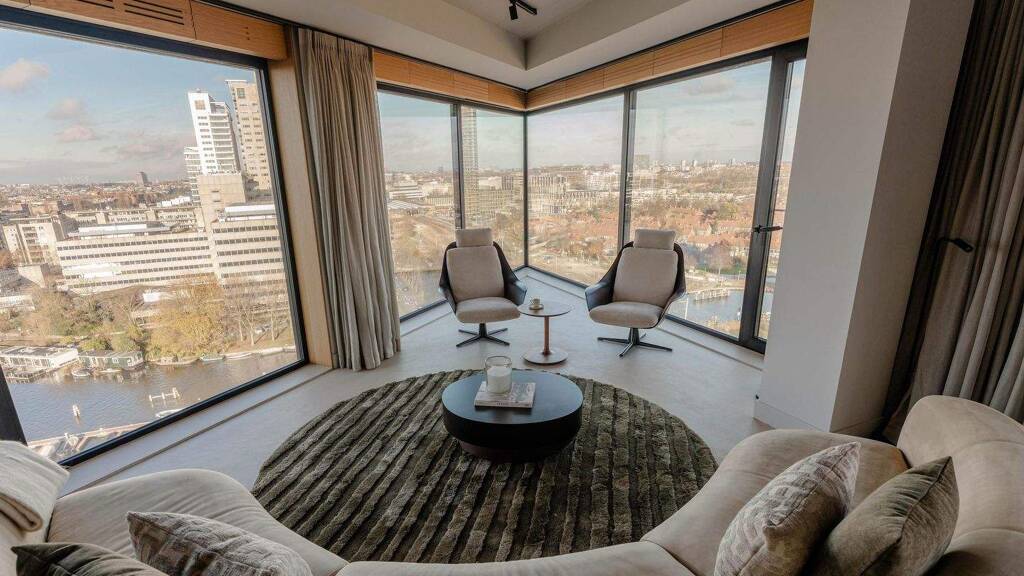 the apartment is accessed via the shared entrance, either by lift or staircase. upon entering, you arrive in a spacious hallway that provides access to nearly all rooms of the property. from here, you reach the generous living room with open kitchen, three bedrooms, a bathroom, and a separate toilet. the living room is distinguished by its unique triangular layout and the extensive floor-to-ceiling windows along the façade, which ensure excellent natural light and offer unobstructed views towards the river amstel. the space is generously proportioned and easily accommodates a comfortable seating area and a large dining table. from the living room, there is access to the spacious, covered balconyan inviting outdoor area with beautiful views over the city and the water. the open kitchen is centrally positioned within the living area and designed in a modern, sleek style. it is equipped with high-quality built-in appliances, including an induction cooktop with integrated extraction, a quooker, a climate-controlled wine cabinet, a fridge/freezer combination, a dishwasher, and two gaggenau ovens. the apartment features three well-proportioned bedrooms. the largest bedroom benefits from an en-suite bathroom, luxuriously finished with a washbasin and vanity unit, walk-in shower, and toilet. the second bathroom is accessible from the hallway and includes a walk-in shower, double washbasin, and a light, contemporary finish. in addition, there is a separate toilet.