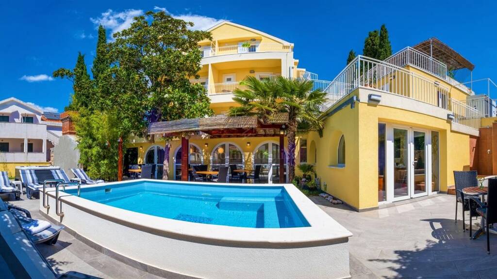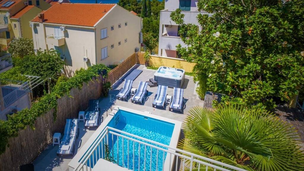 Apartmenthaus mit Pool zum Verkauf in Cavtat in der Nähe des Meeres. Das Haus hat insgesamt 675,55 m2 Wohnfläche und verteilt sich auf vier Etagen. 14 Schlafzimmer mit Bädern verteilen sich auf die Etagen. Im Untergeschoss gibt es eine Taverne, Küche, Esszimmer, Speisekammer und zwei Toiletten. Rezeption, Aufenthaltsraum mit Speisekammer, vier Schlafzimmer mit Bad und Terrasse befinden sich im Erdgeschoss, während sich im ersten und zweiten Stock die restlichen neun Zimmer befinden. Vor dem Haus befindet sich eine geräumige Terrasse mit allen notwendigen Einrichtungen, die den Komfort diese Immobilie vervollständigen (Schwimmbad, Sauna, Whirlpool, Außengrill). Objekt verfügt über gesicherte Parkplätze. Die Immobilie verfügt über ein seit langem etabliertes Geschäft und befindet sich in einer kleinen Touristenstadt, 15 km von Dubrovnik entfernt. Tolle Investitionsmöglichkeit!