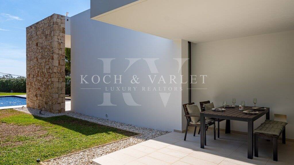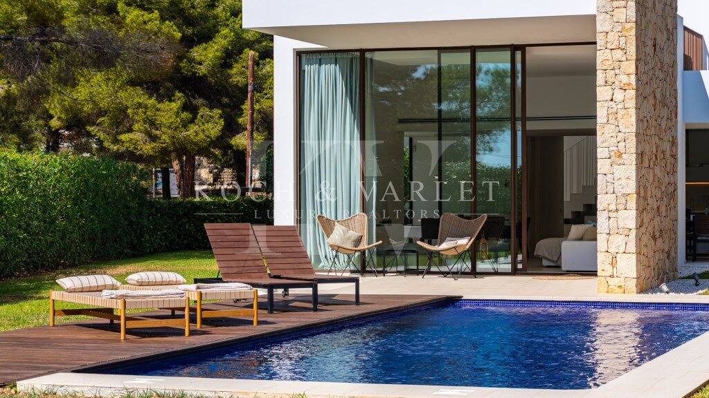 Das Innere des Hauses zeichnet sich durch seine geräumigen, hellen und sorgfältig gestalteten Räume aus, in denen zeitgenössische Architektur mit Funktionalität übergeht. Es verfügt über 5 Schlafzimmer, die zum Ausruhen einladen, 4 komplette Badezimmer und eine zusätzliche Toilette sowie ein Hauptwohnzimmer und ein Esszimmer, die mit einer modernen amerikanischen Küche verbunden sind, die voll ausgestattet ist. Die großen Fenster lassen reichlich natürliches Licht herein und schaffen eine flüssige Verbindung zwischen Innen- und Außenbereich, was in jedem Raum ein Gefühl von Kontinuität und Wohlbefinden vermittelt.