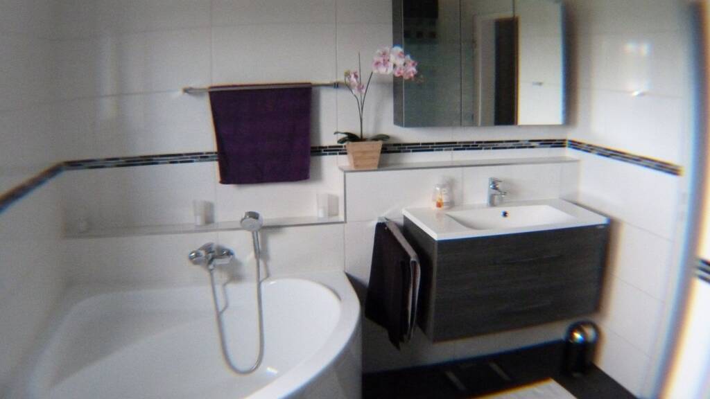 Das Badezimmer lässt keine Wünsche offen, hier haben wir eine großzügige Eckbadewanne und eine ebenerdige Dusche mit Glastür. Die Wände sind Hochglanz weiß gefliest, Mosaik Ornamente geben dem ganzen das gewisse ETWAS. Der Fliesenboden wurde als schöner Kontrast in der Farbe Schiefer gewählt.