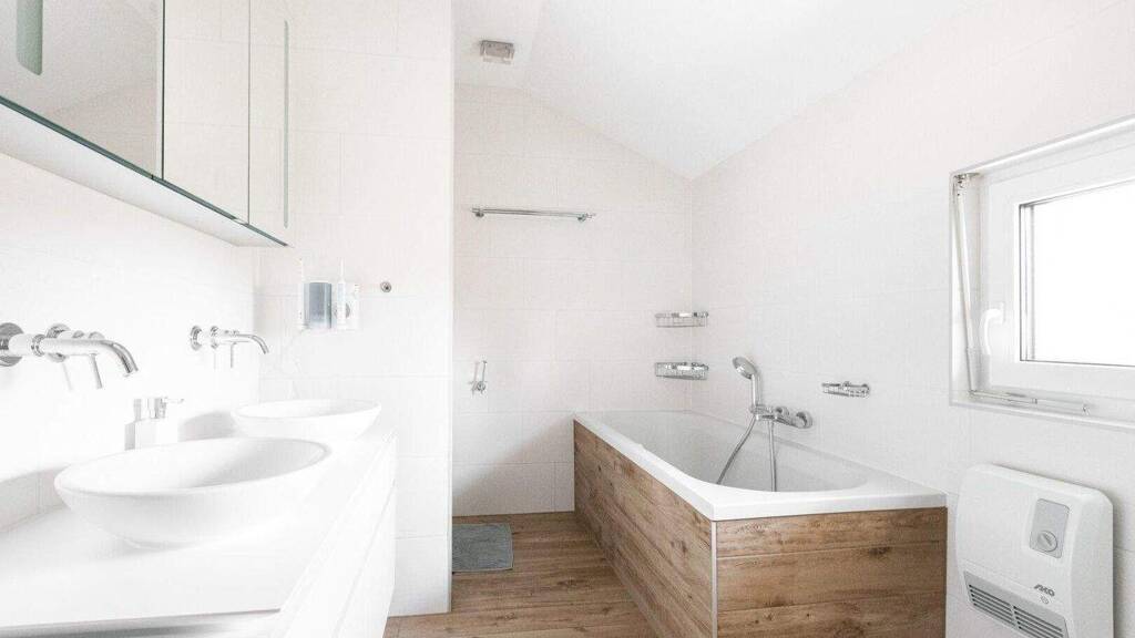 * BADEZIMMER: Badewanne, Dusche, Waschbecken und Waschmaschinenanschluss
