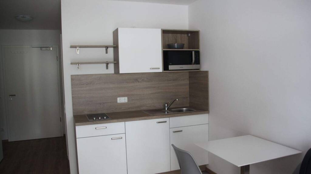 Ausgestattet ist das Apartment mit einer EBK, Tisch, Stühle, Schreibtisch, Schrank und einem Bett. Im gesamten Wohnraum wurde eine hochwertige Design Vinyl Fußbodenbelag verlegt.