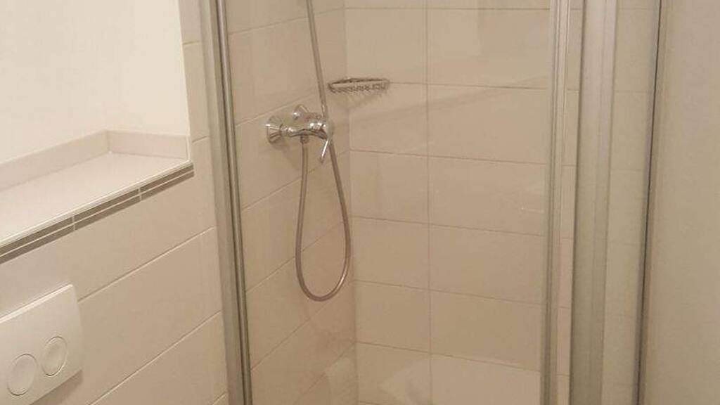 Im Badezimmer wurden Fliesen verlegt. Ausgestattet ist das Badezimmer mit einer Dusche, einem Waschbecken und einem WC.