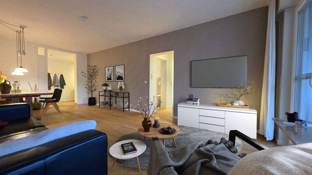Bequem mit dem Aufzug oder sportlich zu Fuß erreichen Sie die 4 Zimmer Wohnung im 3. Obergeschoss. Schon beim Eintreten wirkt alles angenehm hell und offen: Die Diele führt in die halboffene Küche, die mit hochwertigen Geräten von Neff und einer weißen Keramikspüle von Villeroy & Boch ausgestattet ist. Das hell geflieste Gäste-WC, den kleinen Abstellraum sowie den großzügigen Wohn-Essbereich erreichen Sie ebenfalls von der großen Diele.