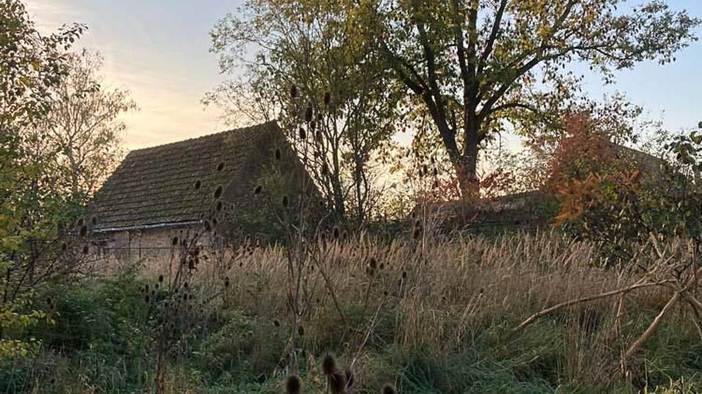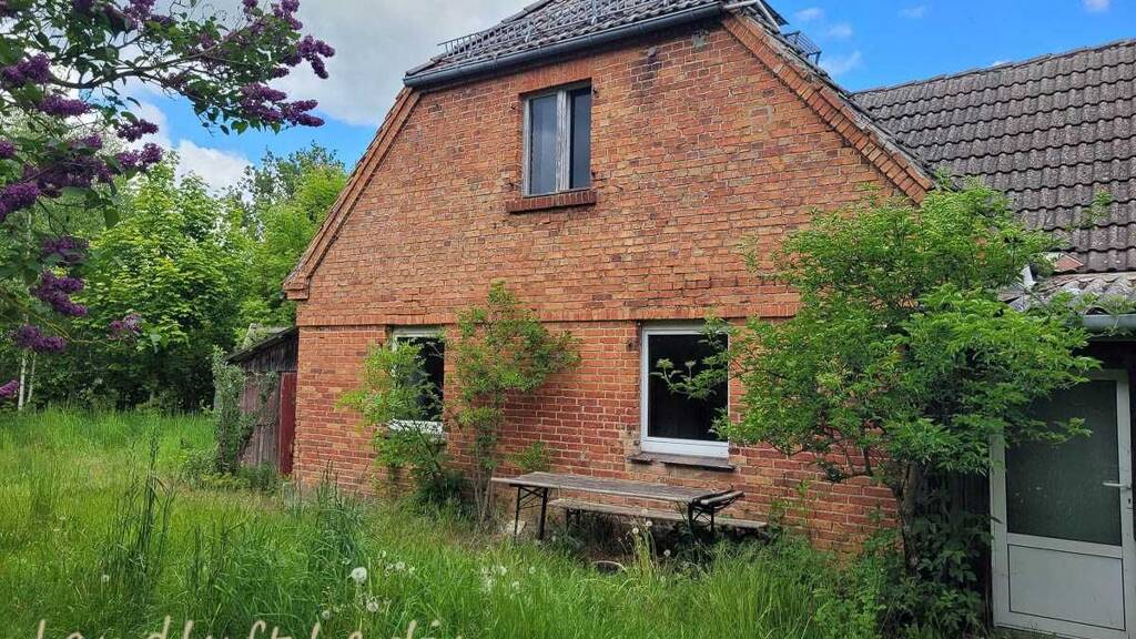 This redbrick farmworker´s dwelling with an inhabitable area of about 90 m², built in 1936 has been partly renovated but is still in need of further work. Its side wing connects to the mirror-inverted house of the neighbour. The place lies only a few hundred meters from the nearest main road, in the middle of a wide open agricultural landscape in the northern tip of Brandenburg, about a 1½ h drive north of Berlin. Several fruit trees grow on the plot. It is hammer shaped has an area of about 3,660 m² and has not been looked after for a while. In addition, there are two smaller stables (about 50 m² base area), a shed, a garage and a sizable tree house in the large walnut tree.