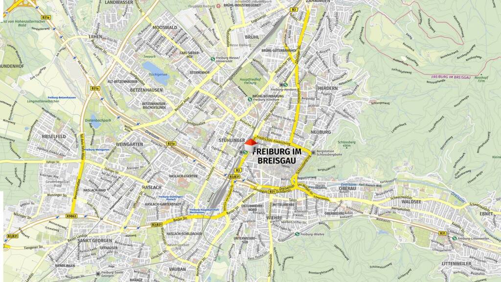 Auch verkehrstechnisch ist die Lage ideal: Der Hauptbahnhof fungiert als zentraler Knotenpunkt für den öffentlichen Nah- und Fernverkehr. Mehrere Straßenbahn- und Buslinien sorgen für eine dichte und zuverlässige Anbindung in alle Stadtteile. Die Autobahn A5 ist in nur etwa sieben Fahrminuten erreichbar und stellt zusammen mit den Bundesstraßen B3 und B31 eine exzellente Verbindung an das überregionale Straßennetz sicher. Der EuroAirport Basel-Mulhouse-Freiburg liegt rund 60 Kilometer entfernt und ist bequem über eine direkte Busverbindung erreichbar. Die Kombination aus zentraler Innenstadtlage, exzellenter ÖPNV-Anbindung und guter Erreichbarkeit über Straße und Luftweg macht den Standort zu einer besonders attraktiven Adresse für Unternehmen und Dienstleister.