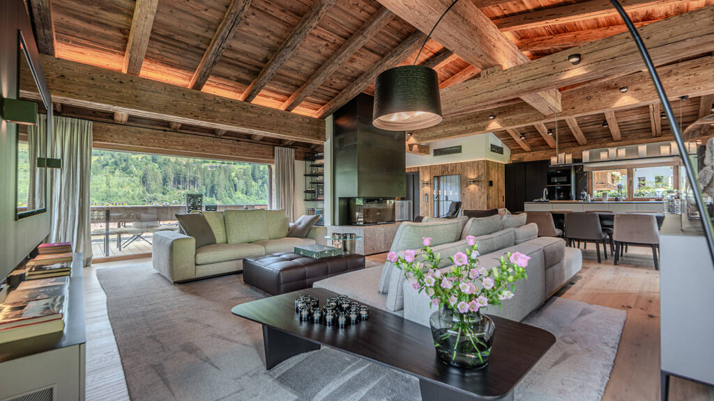Über den eleganten Treppenaufgang oder den Personenaufzug erreichen Sie das Herzstück des Chalets: den offen gestalteten Wohn- und Essbereich im Obergeschoss, der mit einem eindrucksvoll proportionierten Altholz-Sichtdachstuhl begeistert. Dieser wunderschöne, vollständig möblierte Bereich lässt keine Wünsche offen. Neben einer exklusiv ausgestatteten Küche mit Back-Kitchen, einem stilvollen Kamin und einem einladenden Esstisch gibt es auch einen herrlichen Lounge-Bereich. Panoramafenster inszenieren die Umgebung perfekt und eröffnen herrliche Ausblicke auf die beeindruckenden Kitzbüheler Alpen. Die umlaufende Terrasse bietet reichlich Platz für genussvolle Stunden in der Sonne.