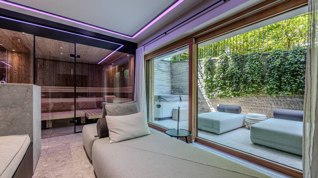 Im Untergeschoss, das aufgrund der Hanglage des Gebäudes komplett mit natürlichem Licht versorgt wird, befindet sich ein weiterer Höhepunkt: der trendige Wellnessbereich. Die Gestaltung in Altholz und Naturstein schafft eine außergewöhnlich wohlige Atmosphäre. Dieser perfekte Bereich zum Entspannen umfasst eine Sauna, ein Dampfbad, eine Erlebnisdusche, Daybeds sowie eine Wellnessbar. Der geschützte Außenbereich samt Jacuzzi ist eingebettet in einen liebevoll gestalteten Garten, der über einen seitlich angelegten Zugang erreichbar ist.