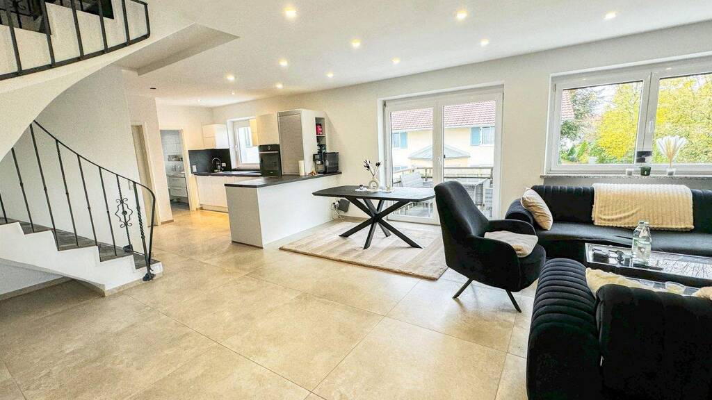 Willkommen in Ihrem neuen Zuhause Entdecken Sie diese außergewöhnliche 4-Zimmer-Maisonettewohnung, die durch ihren Drei-Seiten-Ausblick und den besonderen Eckhaus-Charakter ein einzigartiges Wohngefühl vermittelt – fast wie in einem eigenen Haus. Gelegen in Weidach, einem ruhigen und idyllischen Ortsteil von Durach, bietet diese Immobilie mehr als nur ein Zuhause – sie ist ein Ort zum Ankommen und Wohlfühlen. Mit einer großzügigen Wohnfläche von ca. 118,95 m², verteilt auf zwei Ebenen, erfüllt diese Wohnung alle Wünsche an modernes und gemütliches Wohnen. Perfekt durchdachtes Wohnkonzept Die Maisonettewohnung überzeugt mit einer intelligenten Raumaufteilung, die Funktionalität und Eleganz verbindet: Erdgeschoss (ca. 74,55 m²): Der Mittelpunkt der Wohnung ist der großzügige, offen gestaltete Wohn- und Küchenbereich, der mit hochwertigen Materialien und einer neuwertigen Einbauküche ausgestattet ist – diese ist bereits im Kaufpreis enthalten. Große Fensterflächen sorgen für eine helle, lichtdurchflutete Atmosphäre und unterstreichen das moderne Wohngefühl. Eine vollständig unabhängige, elektrisch betriebene Fußbodenheizung im Wohn-, Koch- und Badezimmerbereich gewährleistet angenehme Wärme und hohen Wohnkomfort. Ergänzend schafft ein stilvoller Pelletofen eine besonders behagliche Wohnatmosphäre. Vom Wohnzimmer aus gelangen Sie auf den großzügigen Westbalkon, der sich ideal für entspannte Abende und sonnige Stunden im Freien eignet. Darüber hinaus verfügt das Erdgeschoss über ein geräumiges Zimmer mit Zugang zu einem zweiten Balkon, das über einen Heizkörper beheizt wird und sich flexibel als Schlafzimmer, Gästezimmer oder Homeoffice nutzen lässt. Ein großzügig geschnittenes Badezimmer mit WC rundet den komfortablen Wohnbereich im Erdgeschoss ab. Obergeschoss (ca. 43,55 m²): Über eine elegante Granittreppe gelangen Sie in das Obergeschoss, das den oberen Wohnbereich der Wohnung bildet. Hier befinden sich ein großzügig geschnittenes Schlafzimmer sowie ein weiteres Zimmer, das sich flexibel als Kinder-, Gäste- oder Arbeitszimmer nutzen lässt. Auch auf dieser Etage befindet sich ein modernes Badezimmer mit WC, das durch hochwertige Materialien und ein zeitloses Design überzeugt. Besonders praktisch: Eine Waschmaschine sowie ein Trockner sind bereits vorhanden und im Kaufpreis enthalten. Diese Etage verbindet Komfort, Funktionalität und eine durchdachte Raumaufteilung auf harmonische Weise. Die Wohnung wurde im Jahr 2023 vollständig modernisiert und erstrahlt heute in einem neuwertigen Zustand. Mit geschmackvollen Akzenten vereint sie modernes Design und eine wohnliche Wärme, die zum Wohlfühlen einladen.