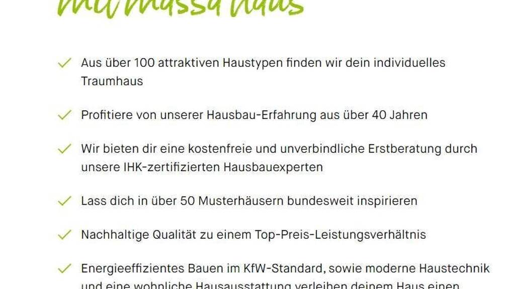 + über 40 Jahre Erfahrung + über 35.000 gebaute Häuser und zufriedene Baufamilien + innovative Top-Architektur + KfW Energieeffizienzhaus 55 + das herausragende massa-Preis-Leistungs-Verhältnis + tolle Hausauswahl, über 60 verschiedene Haustypen + Fenster mit 3-fach Verglasung + 5 Jahre Gesamtgarantie nach BGB + TÜV-Siegel Toxproof für gesundes Wohnen + kompetente Hausberatung in 75 Musterhäusern in ganz Deutschland + Beratung vor Ort + Grundstücksservice + unabhängige externe Finanzierungsberatung + schnelle Bauzeiten, kompetente Baubetreuung + gesundes Wohnen und zertifizierte Top-Qualität vom Ausbauhaus-Marktführer + Made in Germany und vieles mehr