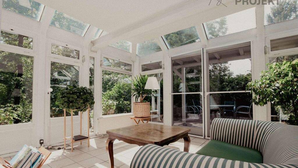 Geradeaus überrascht Sie in das großzügig geschnittene Wohnzimmer mit Panoramafenster in Richtung Wald. Es beeindruckt mit einer Fläche von über 50m² und geht in den direkt angrenzenden Wintergarten mit einer Größe von ca. 20m² über. Dieser offen gestaltete Wohnbereich birgt Platz für Ihren Flügel, eine gemütliche Sofalandschaft sowie einen zweiten Essbereich. Der lichtdurchflutete Wintergarten mit direktem Zugang auf die von einer großen Hecke umgebene Terrasse gliedert sich gekonnt diesem Bereich an.